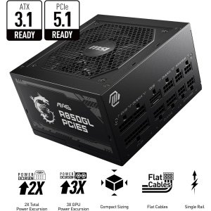 MSI MAG A850GL PCIE5 Power Supply Unit, 850W, 80 Plus Gold, Fully Modular, ATX 3.0, PCIe 5.0 GPU Support, Black Flat Cables, 7 Year Warranty