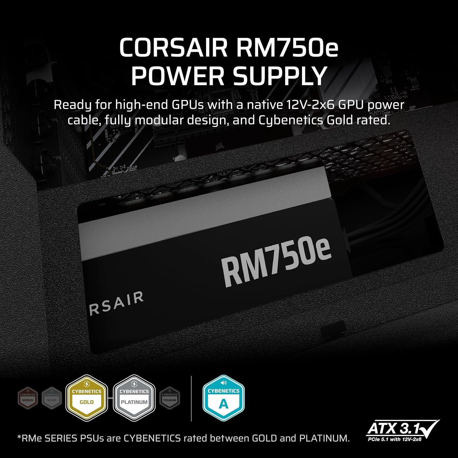 CORSAIR RM750e (2025) Fully Modular Low-Noise ATX Power Supply with 12V-2×6 Cable – ATX 3.1 & PCIe 5.1 Compliant, Cybenetics Gold Efficiency, 105°C-Rated Capacitors, Modern Standby Mode – Black