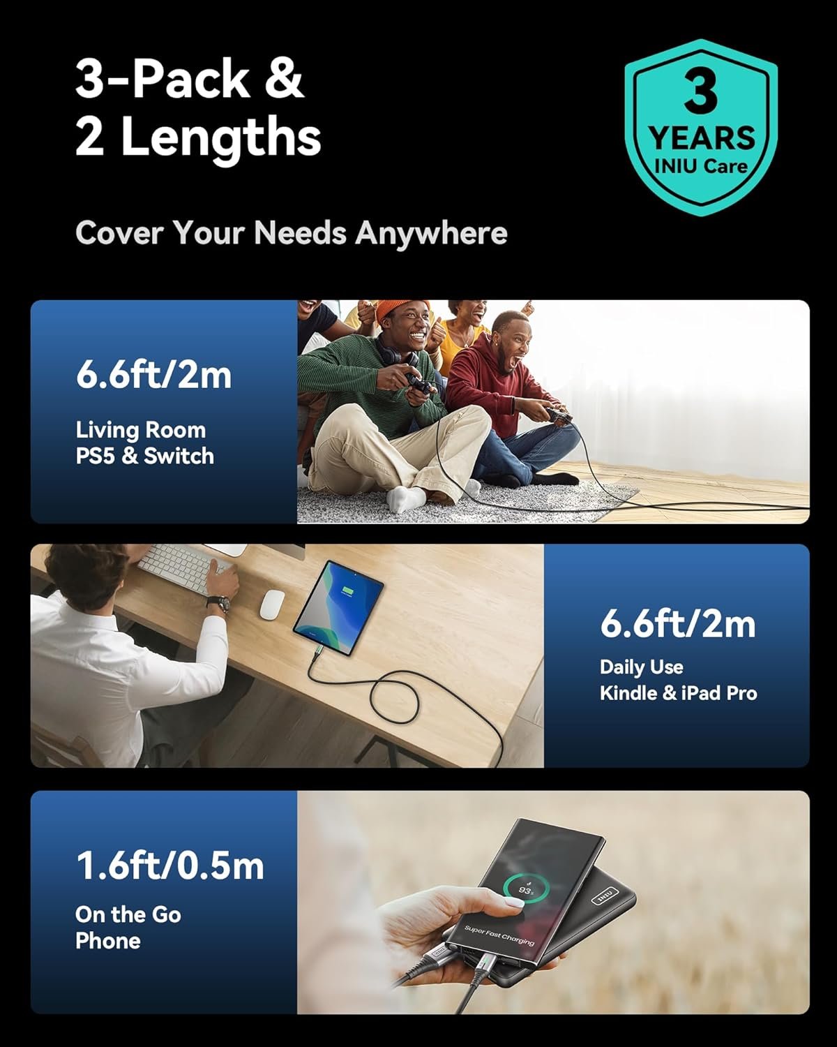 INIU USB C Charger Cable, [3 Pack 0.5+2+2m] USB A to USB C 3.1A Fast Charging, Braided Phone Charger Type C Cable for iPhone 17 16 15 Pro Max Samsung Galaxy S25 S24 S23 Switch PS5 Huawei Pixel 9 etc
