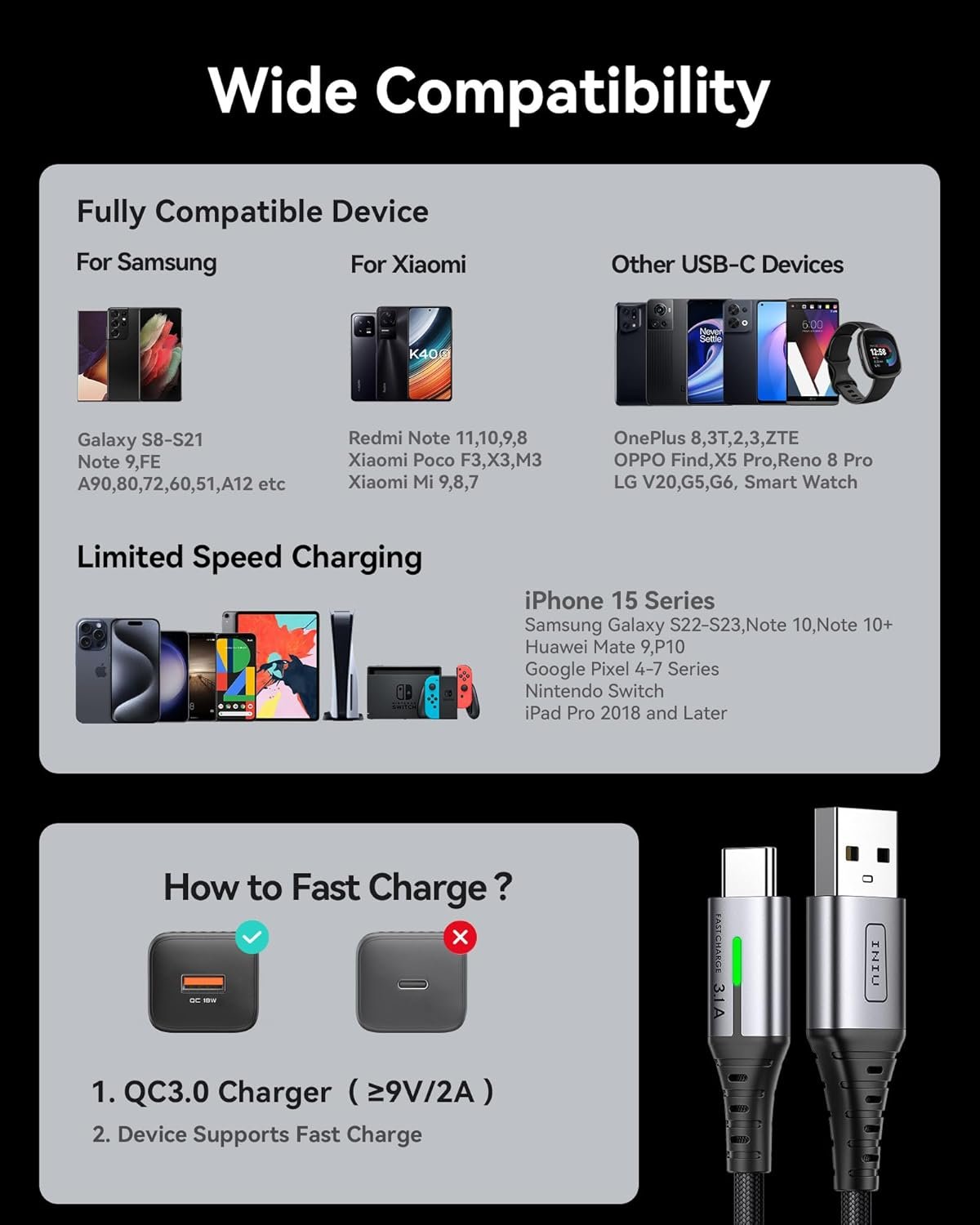 - Perfectly Fit with iPhone 15: Our premium USB-A to USB-C cable ensures reliable charging for your iPhone 15. Stay powered up and connected without compromise. Note: This cable does not support super fast charging for newest iPhone.