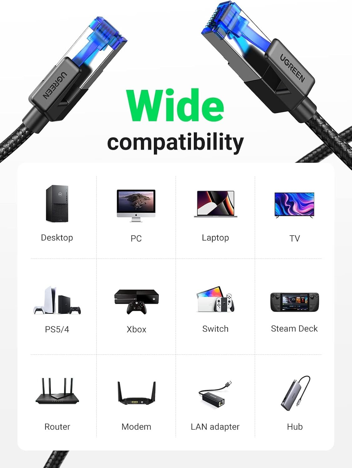 • Wide Compatibility: With the RJ45 Connector, UGREEN Gigabit ethernet cable can be perfectly compatible with computers, laptops, modems, routers, PS5, PS4, PS3, X-Box series, Switch, networking switches, ADSL, network adapters, hubs, and other networking devices. It can also be fully backward and compatible with Cat7, Cat6e, Cat6, Cat5e, and Cat5.