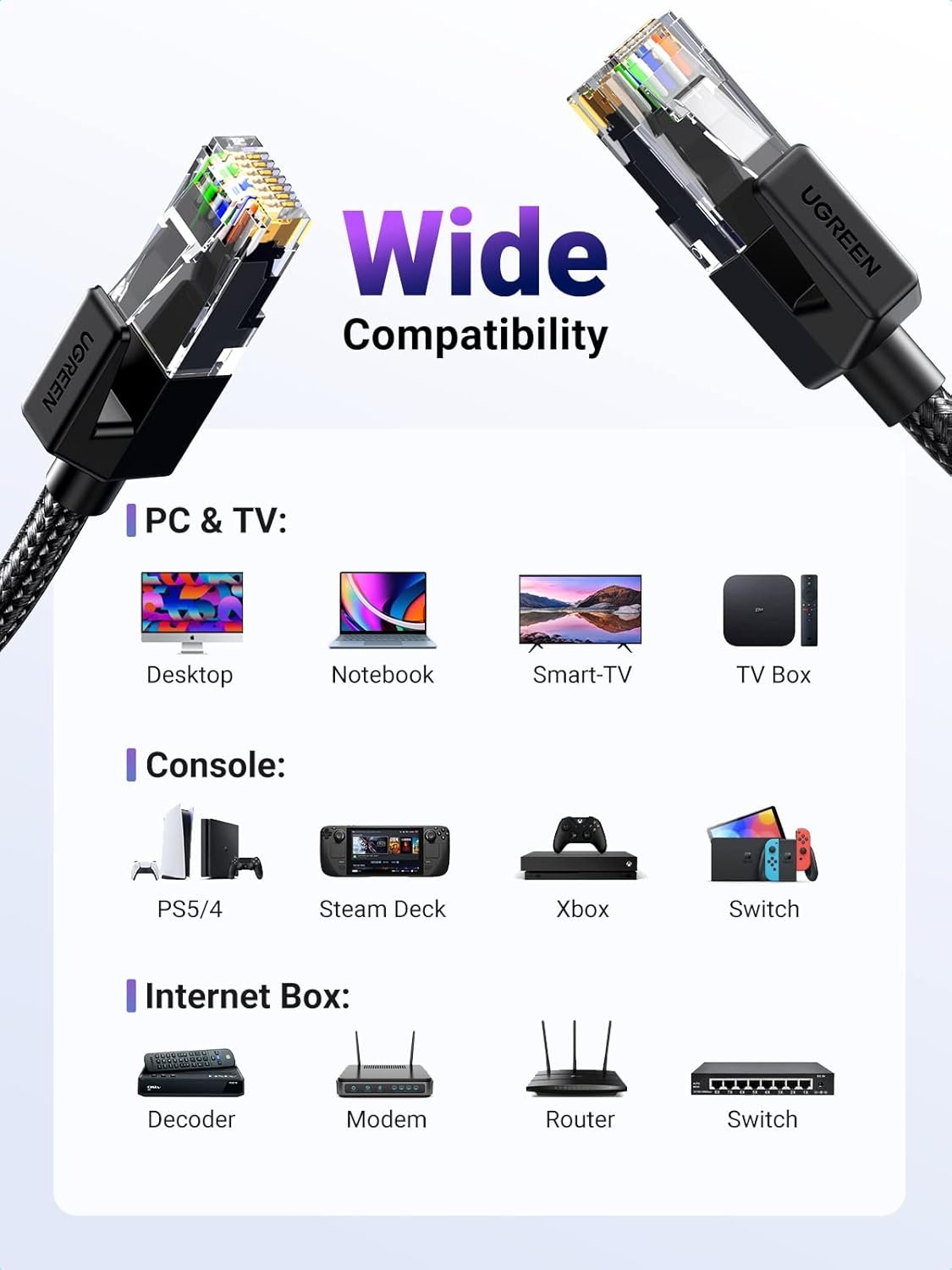 • Universal Compatibility: This high-speed RJ45 LAN cable is not only backward compatible with cat5, and cat5e cables but also works well with all RJ45 connector devices such as iMac Pro, PS5, PS4, PS4 Pro, PS3, WiFi extender, Switch, Smart TV, Xbox, Xbox One, Sky Q box, video game consoles, TV decoder, BT Smart Hub, Virgin modem, Patch Panel, Router, PCs, Network printers, media players, NAS, VoIP phones, Blu-ray Player, etc.