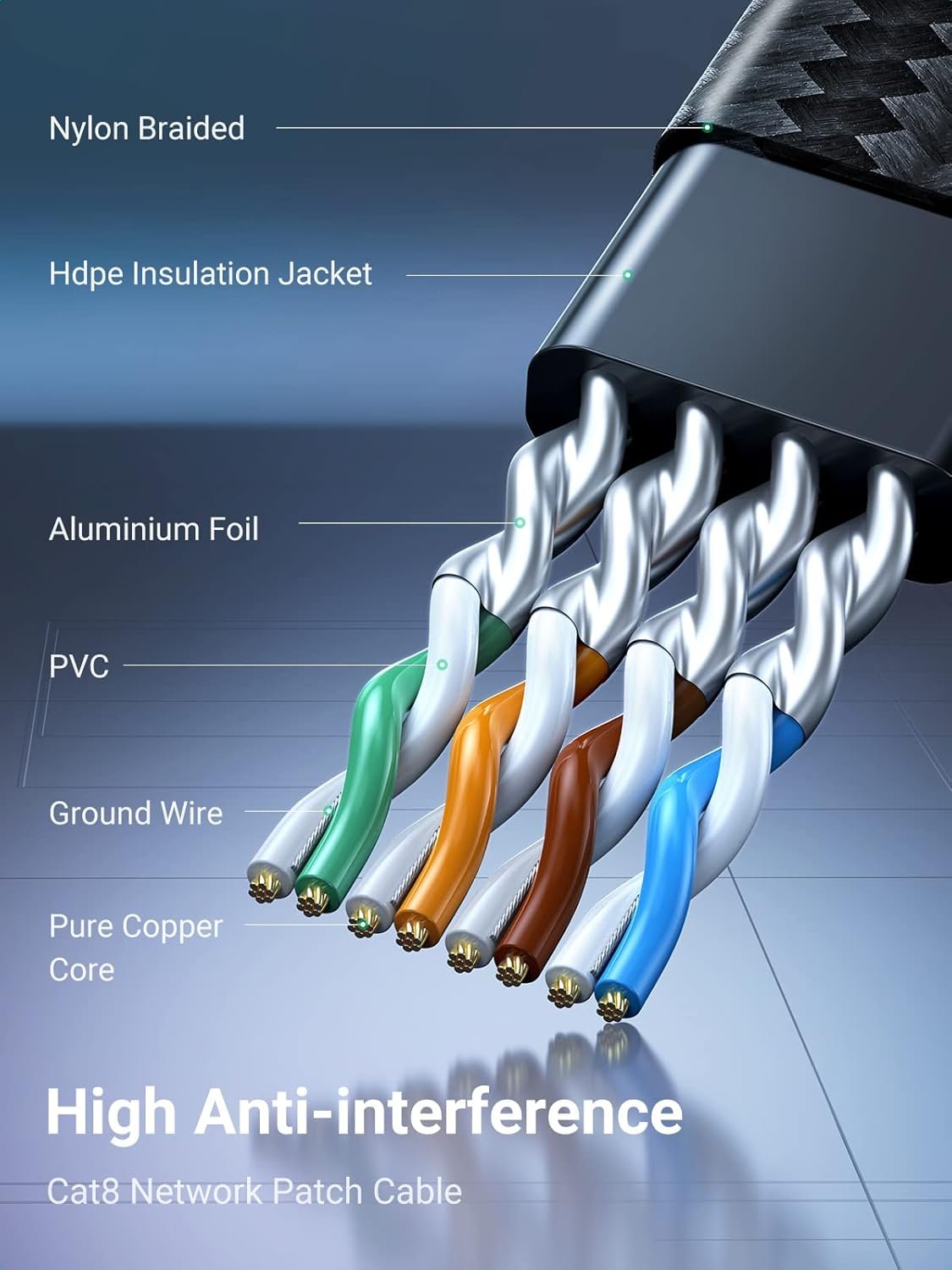 - Durable Braided Design: UGREEN Cat 8 Flat Ethernet cable wrapped with quality cotton braided cord makes the LAN cable stronger and more durable. The test proves that this internet cable can be bent at least 10000 times without breaking, which is suitable for long-term use.